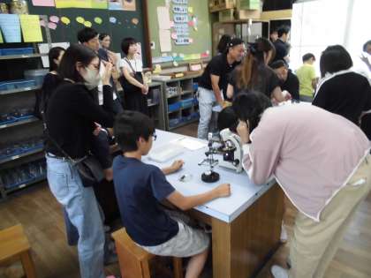 卵の中でかすかに動くメダカの赤ちゃんの様子に子どもたちも保護者の方も大興奮。