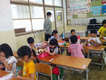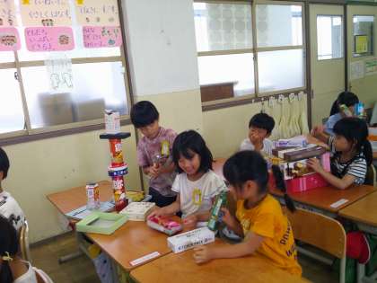 算数の時間に、いろいろなかたちの箱を使って、グループで動物やタワー、アスレチックなどを作りました。とても楽しそうに作っていました。