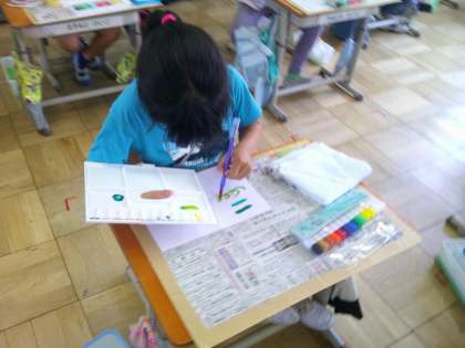 図画工作科の学習では、初めて絵の具セットを使いました。パレットや筆洗の使い方を学習し、実際に画用紙に色を塗ってみました。また、色の混ぜ方も学習し、色作りを楽しんでいました。