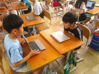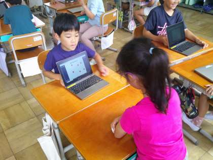 英語活動では、「いくつかなクイズをしよう」をしました。1から10までの言い方とHow many 〜?の言い方を学習しました。学習したことを生かして、いくつかなクイズをタブレットで作り、みんなで出し合いました。たくさんやり取りをして、楽しく学習することができました。
