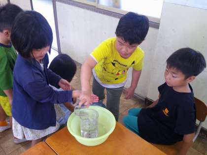 算数科の学習では、「かさ」を学習しています。L、dLなど、かさの単位を知りました。実際にリットルます、デシリットルますを使って、どれくらいの量かを確かめながら学習しました。