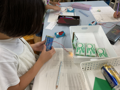 「これはつかないんだ!」「あ!明かりがついた!」など班で協力しながら取り組んでいました。