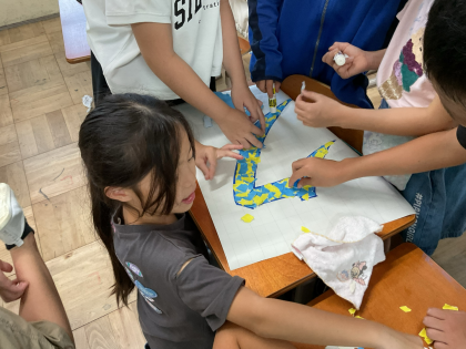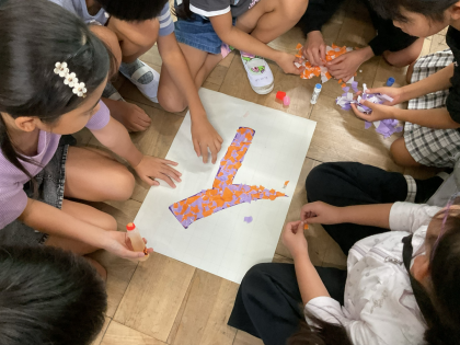 みんなで協力しながらスローガンの文字を折り紙で切り貼りしました。