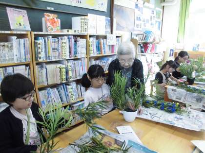 地域の先生の指導のもと、前回より全体の見え方やバランスを意識して生けることができました。校長先生も生け花にチャレンジしました。