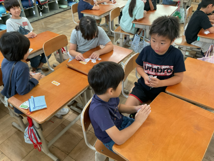 算数の学習では、「かけざん(1)」で九九カードを使って九九を覚えています。今日は3のだんをやりました。何度も繰り返して言ったり、ペアで問題を出し合ったりして、頑張っています。