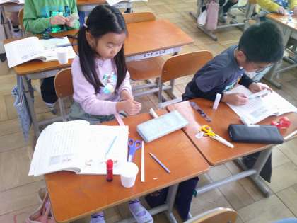 国語科の学習では、「紙コップ花火の作り方」という説明文を読んでいます。説明文を読んで、実際に紙コップ花火を作りました。どこを読んでいけばよいか、よく考えて作っていました。