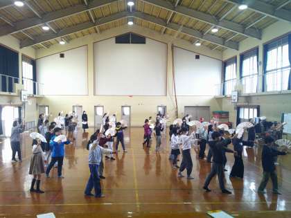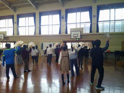 扇子を手に、ぎおん小唄の曲に合わせて踊り、学習の最後には列ごとに発表会も行いました。