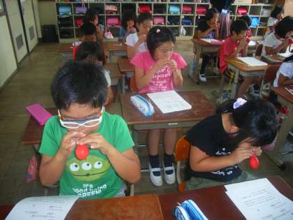 12日の金曜日の日に,3年生は大学の先生・学生と一緒に歯の学習を行いました。咀嚼回数を調べるためのガムをかんだり,頬の力を確かめるために風船を膨らませたりと普段と違った学習に楽しそうに取り組んでいました。