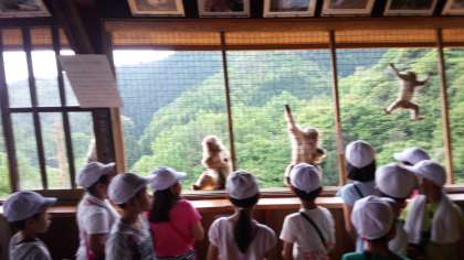 それから,メインの岩田山モンキーパーク。3日前に生まれたばかりの赤ちゃんがいたり,30年以上もいるおばあちゃんのサルがいたりと,飼育員の方にいろいろ説明をいただきました。それから,サルにえさやり体験をして,楽しく下山しました。