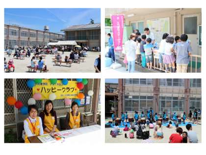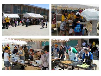 正門前ではリサイクルコーナーや子育てサロン等のコーナーが設けられて、また運動場では「みたらしだんご」「カレーライス」「焼きそば」がふるまわれ、盛況のうちに終了となりました。お天気にも恵まれ、多くの地域の皆様の参加がありました。