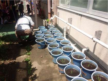 ゴールデンウィーク明けに用意したバケツに稲を植えました。