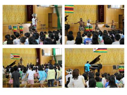 今日の演目は、音楽「地球ハーモニーコンサート」と題して、第1部はジャナグルと言うジンバブエの歌と踊り、第2部は河野康弘さんのピアノ演奏、第3部は「チューリップ」をみんなで歌うというものです。