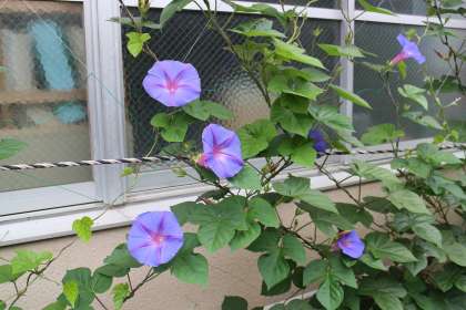 西洋朝顔の仲間の「オーシャンブルー」という品種が以前に植えられていて、それが写真のように理科室の南側の窓の下のところまで伸びてきました。一部、キュウリを植えて楽しんでいます。ところどころに日本のアサガオも芽を出していて、ひと月先には花を楽しむことができるかと思います。