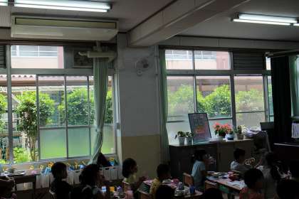 この間、二階の3教室に扇風機を設置したことをホームページでお知らせいたしましたが、それを読まれたり子どもさんから聞かれたりしたPTAの本部の皆様が「一階の4教室にも設置しませんか。費用を負担しましょう。」と申し出ていただきました。
