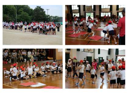 本日16日、楽只小学校において北下支部育成学級合同運動会を開催しました。雨が心配されるので、少し早めに「開会式」「準備体操」「ペアでゲット!キラキラメダル(徒競走)」とすすめましたが、やっぱり途中で雨。体育館に入って続きから始めることとしました。