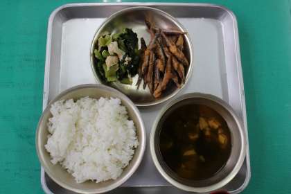 本日の献立は、ご飯、小松菜と湯葉の煮びたし、きびなごの琥珀上げ、若竹汁です。