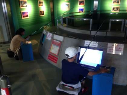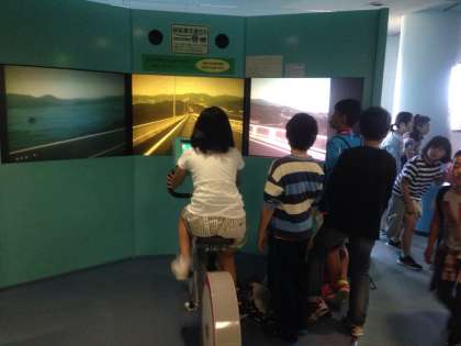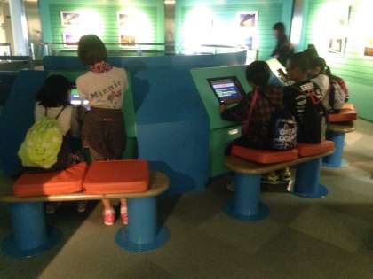 大鳴門橋架橋記念館に入りました。クイズに挑戦したり,手裏剣投げをしたり,楽しんでいます。もちろん,渦のでき方も学んでいます。