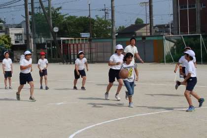 この暑さの中ではありますが、写真のように運動場では球技クラブがバスケットボールのようなゲームをしています。音楽室では合唱や合奏をしています。