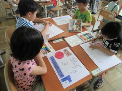 昨日,1年生の子どもたちは,立体の形を画用紙に写し取る学習をしました。今日は,形の特徴を生かして絵を描く活動に挑戦です。箱の形から家や電車をイメージしたり,丸の形からスイカやサッカーボールに仕上げたり……。複数の形を組み合わせて描いている児童もいました。