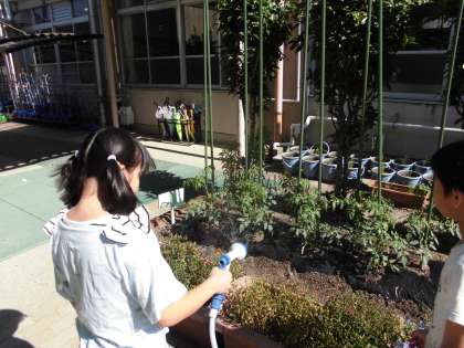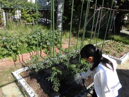 5年生が,曜日ごとに当番を決めて,朝と放課後に水やりをしています。子どもたちは,トマトの生長が楽しみなようで,毎日熱心に水やりに取り組んでいます。
