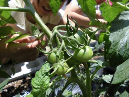 茎もぐんぐんと伸びているので,新たに誘引をしたり,追肥をしたりしました。実が大きくなってきたので,子どもたちの「トマトを育てている」という実感も,より大きくなってきているようです。