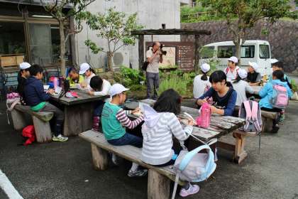 ハイキングに持っていくはずのお弁当を玄関前広場でいただきました。みんな元気に過ごしています。