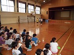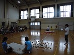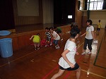 前回と同じく,低学年から高学年の子どもたちが協力して,玉をマットの上に,落とさないように慎重に置いて次の人へつなぎます。