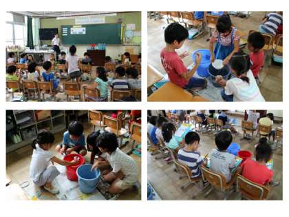 この学習では,実際に水を使って,なべやバケツなどの容れ物にどのくらいの量が入るのか,実感しながら単位や量の大きさを学べるように進めていきます。また,「1Lはないけれども,かさはある」という「はしたのかさ」について,dL(デシリットル),mL(ミリリットル)の学習も併せて行います。