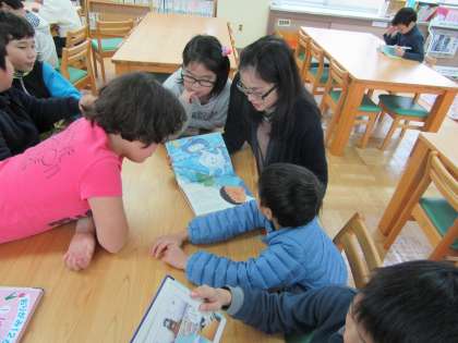 また,普段の生活ではあまり聞きなれない英語での読み聞かせに胸を躍らせ,身を乗り出して聞こうとする子どもたちもいました。