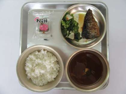 本日の献立は「かまぼこと菜の花の炒め物」「にしんの煮つけ」「赤だし」「ごはん」「桜餅」でした。