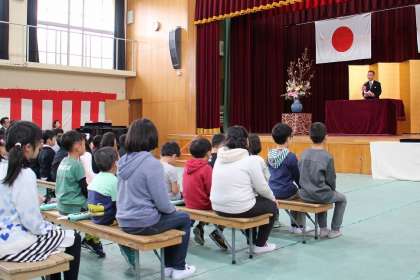 まず初めは、着任式。4名の教職員の紹介を子どもたちにしました。