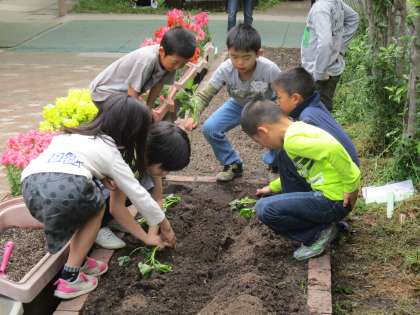 2年生は,学校園にさつまいもの苗を植えました。また,昨年あさがおを育てていた鉢植えには,トマトやキュウリ,枝豆などの苗を植えました。しっかり水やりをがんばって,大きく成長してほしいと思います。