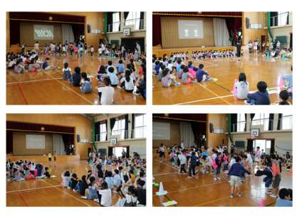 6年生のエスコートで1年生が入場した後、お迎えの言葉があり、1年生の自己紹介、クイズとグループ対抗輪くぐり、全校での「にじ」の合唱、1年生からお礼の言葉と歌があり、終わりのあいさつで終了しました。