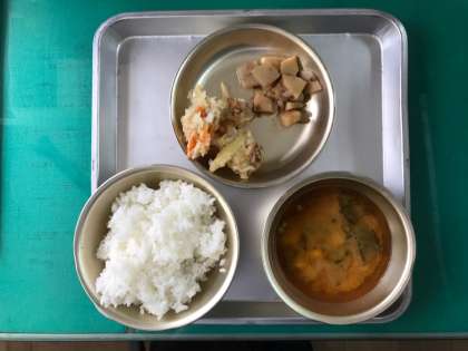 本日の献立はご飯、春のかき揚げ、たけのこのおかか煮、みそ汁でした。