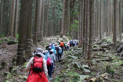 8時30分にオリエンテーションホールに集まり、9時からのハイキングに向けての話を聞きました。そして、出発です。花背山の家から杉林を抜けると、琵琶湖が見える見晴らしの良いところに出ました。