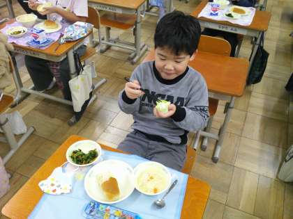 今日の給食の時間に、精米したお米を食べました。5月に田植えをして、水やりや雑草抜き、収穫、脱穀、もみすり、精米とたくさんのことを頑張ってきて、やっと食べられるということもあり、とても嬉しそうでした。食べていると、「おいしい」「やわらかい」「甘い味がする」などいろいろな感想を伝えてくれました。また、栄養教諭の村山先生にもお米についてのお話も聞かせていただきました。お米作りを通して、たくさんのことを学ぶことができました。