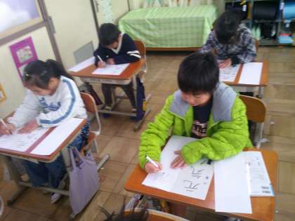 今日の書写の学習では、書き初めをしました。ペンを使って「元気な子」という字を書きました。文字の中心に気を付けて丁寧に書くことができました。