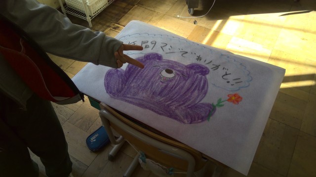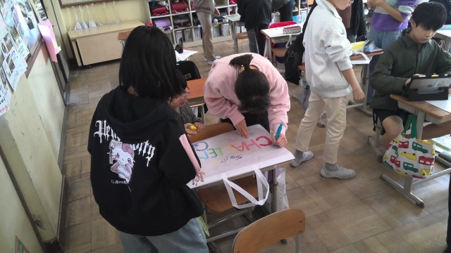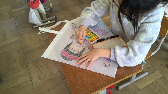 1年間を振り返りながら、友達と楽しそうに話をしつつ、作品バッグに絵を描いていました。