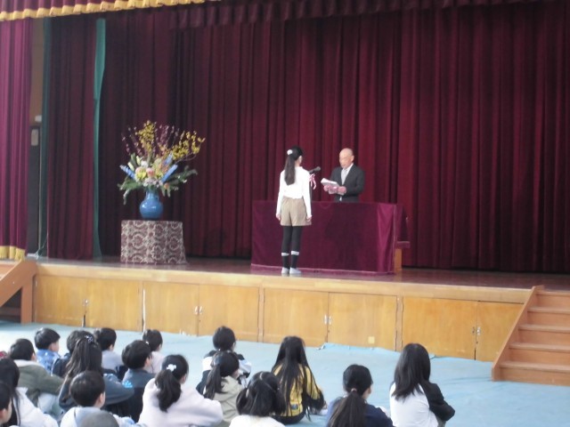 5年生が全校の代表として校長先生から修了証を受け取りました。
