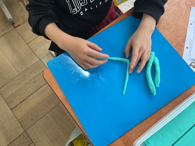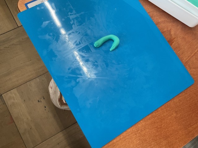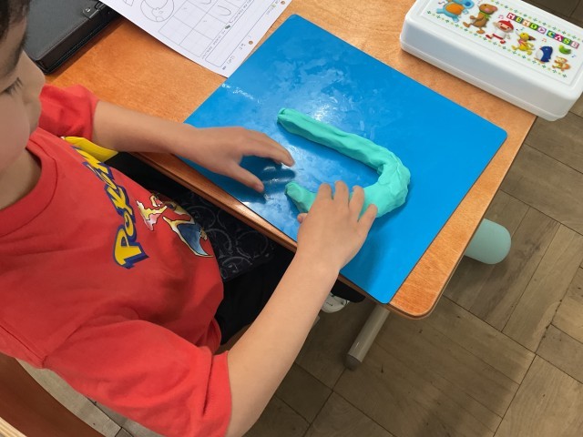 最初にお手本の字を見ながら粘土で形を作りました。