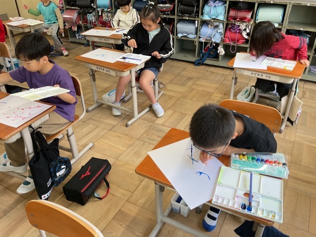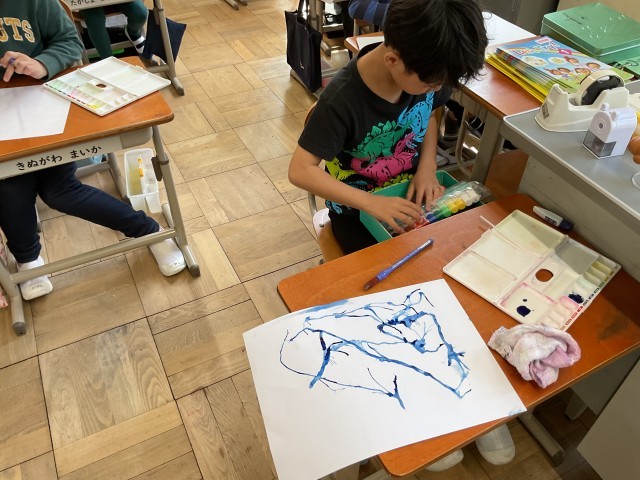 図画工作科の「絵の具➕水➕〇〇=いいかんじ」の学習でストローを使ってみました。