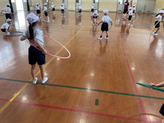 体ならしをした後、フラフープを使って遊びました。
