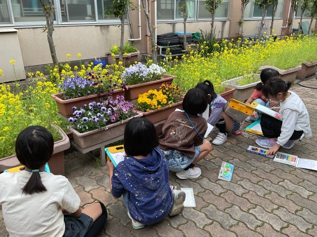 この日は、図画工作科「きせつをかんじて」の学習で春を感じるものを探して絵に表しました。