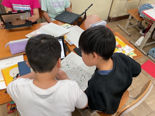 「ここに神社がある」「神社の地図記号はどんなのだっけ?」などグループで話し合いながら校区地図を完成させました。