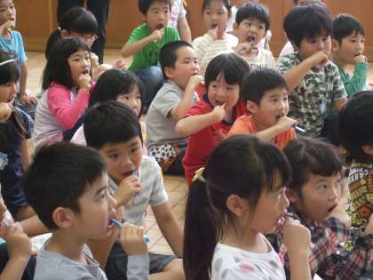 後半は,「なまこちゃん」のようにならないために,正しい歯みがきの仕方について教えて頂きました。歯ブラシの毛先を正面に向ける「こんにちは」と,歯ブラシの背中を正面に向ける「さようなら」の持ち方を覚え,2つの持ち方を使い分けてみがく練習をしました。帰った後も,学んだことを思い出して歯みがきを続けてくださいね。