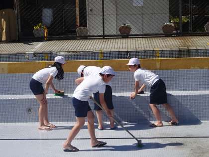 来週よりプール学習が始まります。そのための準備として今日は5・6年生がプール清掃を行いました。6年生は昨年もしているので,慣れた様子でプールサイドをきれいにこすっていました。暑い日でしたので,ホースの水がかかるのも気持ちがよく,バケツに水を入れてもらっているはずが水浴びに行っているような子どももいました。