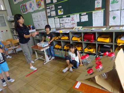 1年1組は玉入れ,1年2組はコイン落とし,ブラックボックス,ボウリングでした。