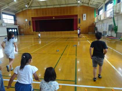 3年生は理科の学習で,ゴムや風の力の勉強をしています。ゴムで動く車を作って体育館で走らせました。子どもたちは,どうすれば遠くまで走るのか工夫しながら楽しんで車を走らせていました。途中から担任の先生の声かけで,決められたラインに近いところまで車を進める事にも挑戦しました。活動をする中で,ゴムののばし方やゴムの数によって車が走る距離が違うことに気づいていました。