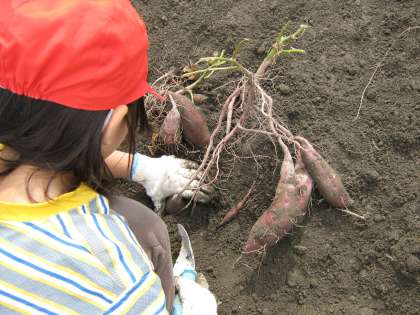 あっちへこっちへ元気に育ったおいもに、みんな大奮闘していました。