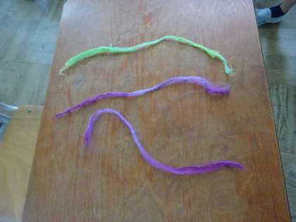 今日はその学習の仕上げとして,できた糸でミサンガを作りました。子どもたちは自分が染めた糸を細い糸になるようにより合わせ,友達と糸を交換しながら3色の糸を三つ編みの要領で編んでいきました。
